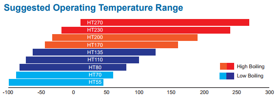 Fluids have low viscosity, no hydrogen in the molecular structure,